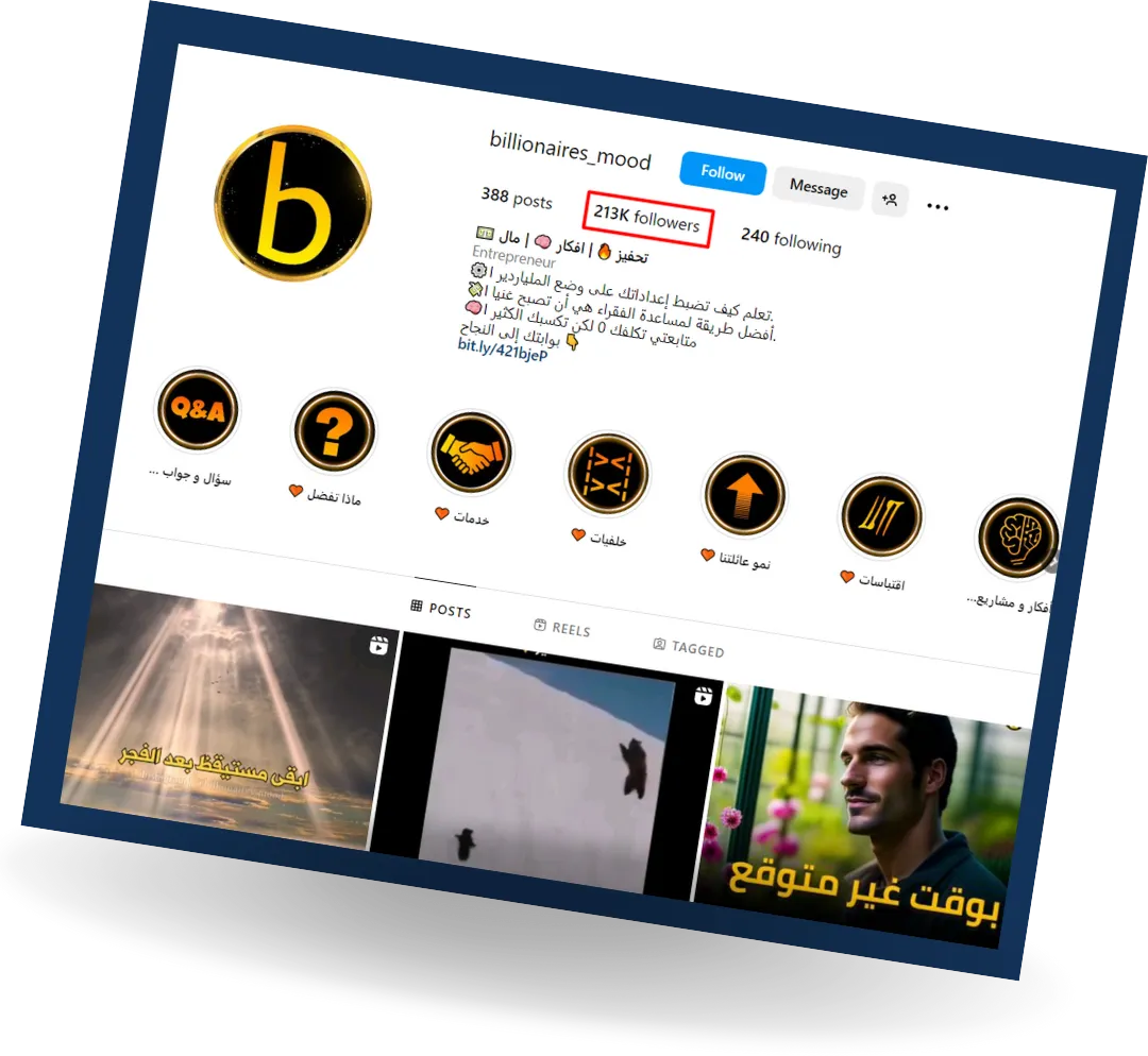 هذا أحد حساباتنا على انستغرام والذي يخص الشركة، نحقق منه الآلاف شهريًا بفضل الله، يضم الحساب 213 ألف متابع حتى وقتنا هذا وفي تزايد مستمر